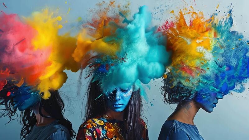 Three individuals showcase creative hairstyles while colorful paints explode from their heads, symbolizing artistic expression and emotion. Each person displays a distinct look and style. Pro Video