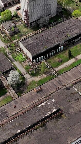 Rusty destroyed roofs of abandoned factory buildings. Empty ruined territory of a factory in spring. Aerial view. Vertical Pro Video