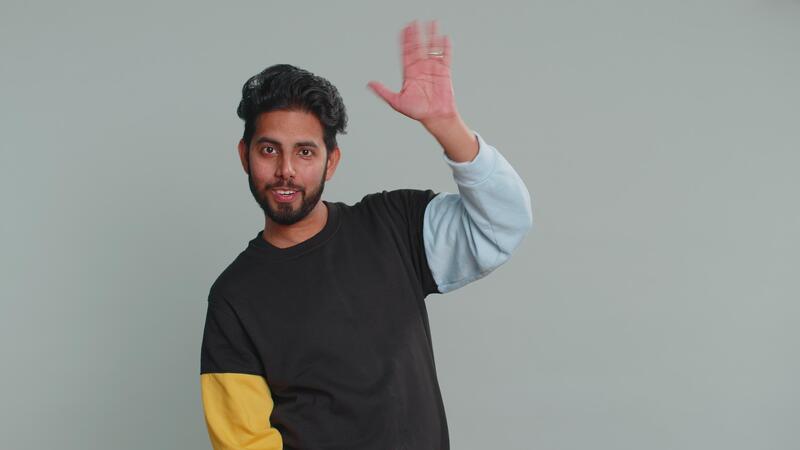 Man showing inviting gesture with hands, ask to join, beckoning to coming, gesturing hello greetings Pro Video