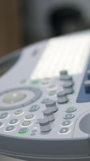 Keyboard, sensor screen and set of buttons on the modern machine for ultrasound diagnostics. Advanced equipment for sonography in clinics. Close up. Blurred backdrop. Pro Video