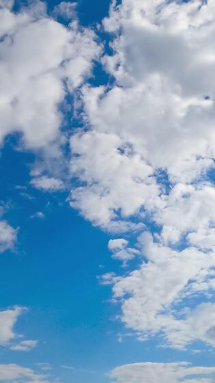 Quick transformation of white soft clouds in the atmosphere. Cumulus cloudscape moving with the wind from low angle perspective. Timelapse. Vertical Pro Video