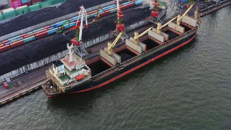 Bulk carrier is loaded with coal in the port using cranes. Drone view