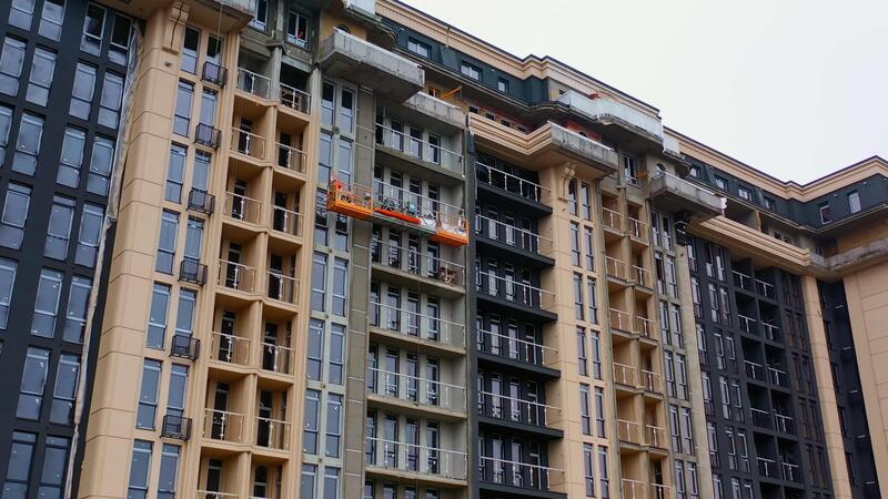 Building of new tower architecture. Modern multi storey building under construction. Front view of a high-rise building. Workers build the tall house. Free Video