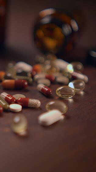 An Array of Different Assorted Pills and Capsules Beautifully Displayed on a Wooden Table Surface Pro Video