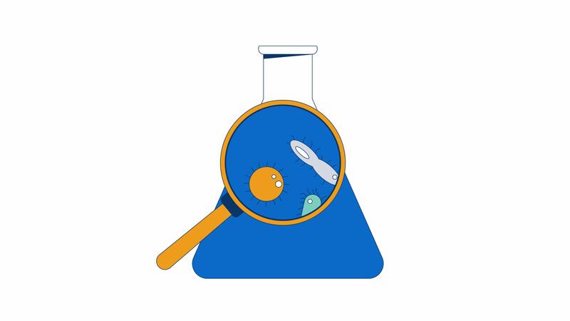 Magnified microorganisms in flask with water 2D object animation. Microbiological research loupe cartoon 4K , alpha channel. Lab experiment glassware animated flat item on white background Pro Video