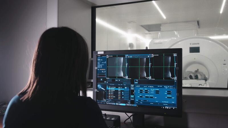 Female Doctor, Radiologist Watching Diagnosis Procedure and Monitors on computer Showing Brain Scans Results, In the Background Patient Undergoes MRI or CT Scan Procedure. Pro Video