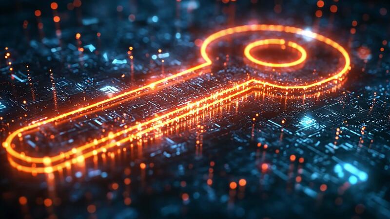 A glowing orange key symbol appears on a dark circuit board, representing digital security and advanced technology in a dynamic environment. Pro Video