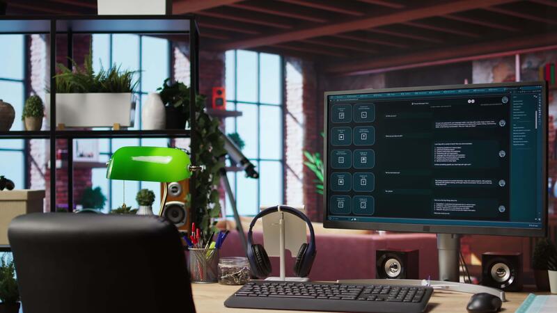Computer setup in bright apartment showing large language model program. PC monitor in cozy home office with AI LLM chatbot answering user prompts using neural network tech Pro Video