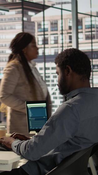 Vertical Male executive analyst finalizes a financial report and reviews data, developing a forecast for organizational progress. Black man engaged in task management and strategy planning. Camera B. Pro Video