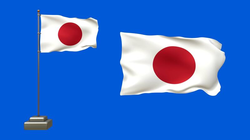 3D animation of two Japanese flags on a blue background. One flag flutters on a waving pole with lifelike motion, while the other waves freely without support Free Video
