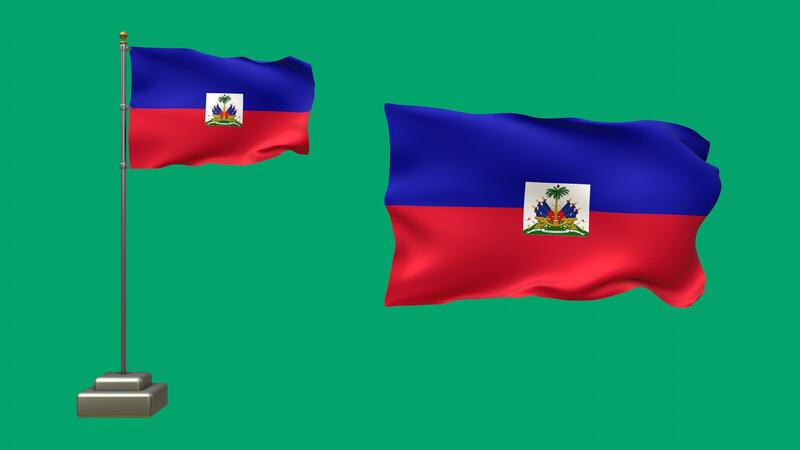 3D animation of two Haitian flags on a green background. One flag flutters on a waving pole with lifelike motion, while the other waves gently without support Free Video
