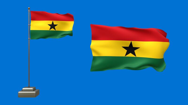 Two Ghanaian flags on a blue background in 3D animation. One flag flutters on a pole with lifelike motion, while the other waves gently without support Free Video