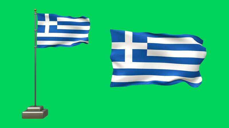 3D animation featuring two Greek flags on a green background. One flag flutters on a waving pole, while the other waves gently without any support Free Video