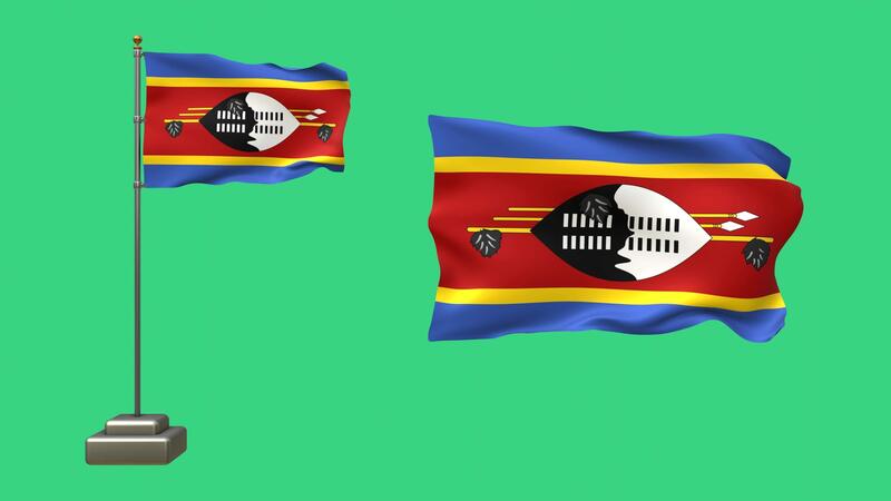 3D animation featuring two Eswatini flags on a green background. One flag flutters on a waving pole, while the other waves calmly without support Free Video