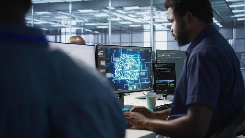 African american worker in data center implements advanced AI driven predictive maintenance systems. Engineer using artificial intelligence to identify hardware failures impacting operations, camera A Pro Video