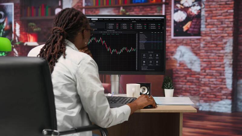 Day trader using PC to purchase and sell stocks, browsing through documentation files to learn how to maximize profits. Investor looking at stock exchange graphs on computer monitor, camera B Pro Video