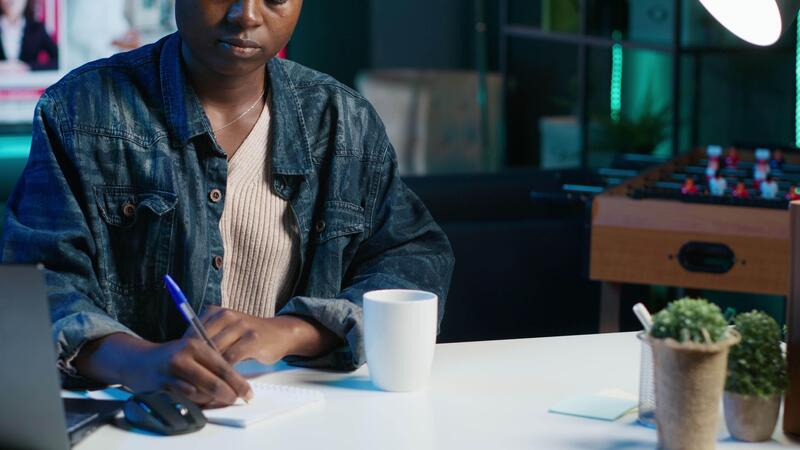 Jolly freelancer noting down ideas on paper using pen while teleworking. Upbeat remote employee working at home office desk, reading information on laptop and writing in notebook, camera A Pro Video