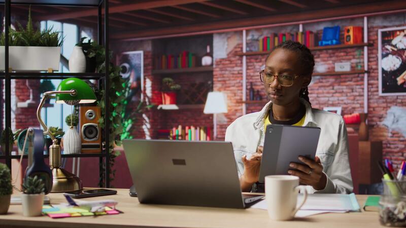 Woman at home taking break from work to look at social media feed on tablet. Remote employee at work in apartment office pausing tasks to use social network application on device, camera A Pro Video