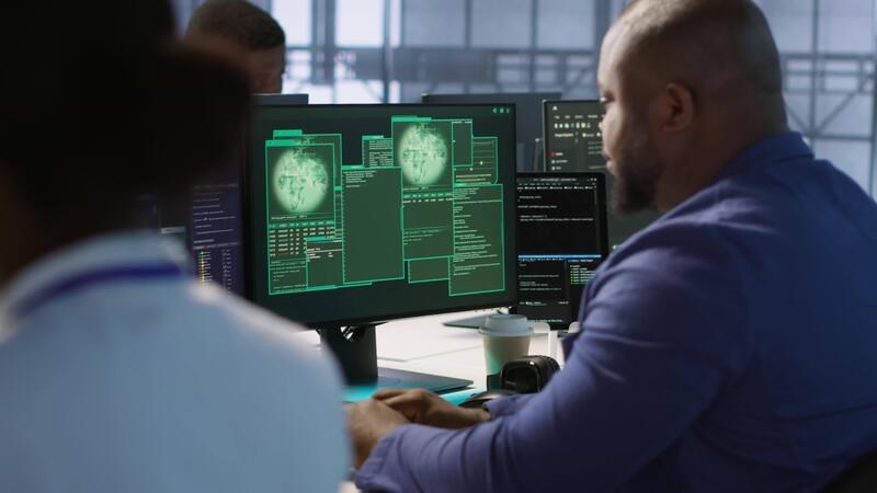 Surprised data center technician celebrating after successfully managing to install cybersecurity framework, reducing security incidents and enhancing data protection protocols, camera A Pro Video