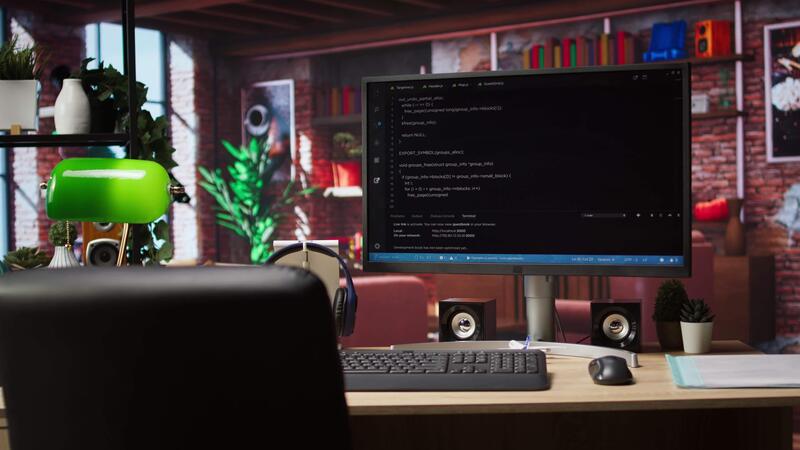 Coding interface shown on computer screen on desk in bright home office. Command lines written in code editor program UI on PC display in modern cozy home living room workspace Pro Video