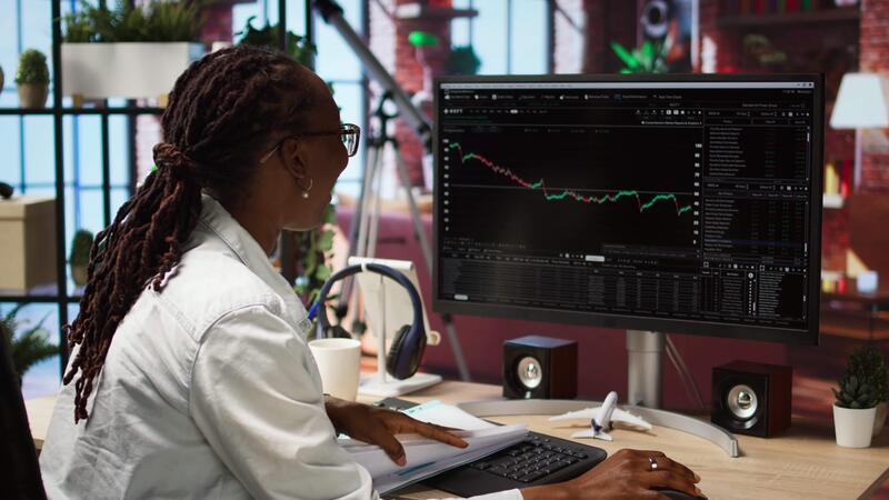 Excited day trader gaining money by selling stocks after browsing through documents to learn how to maximize profits. Thrilled investor celebrating financial gains earned from stock exchange, camera A Pro Video
