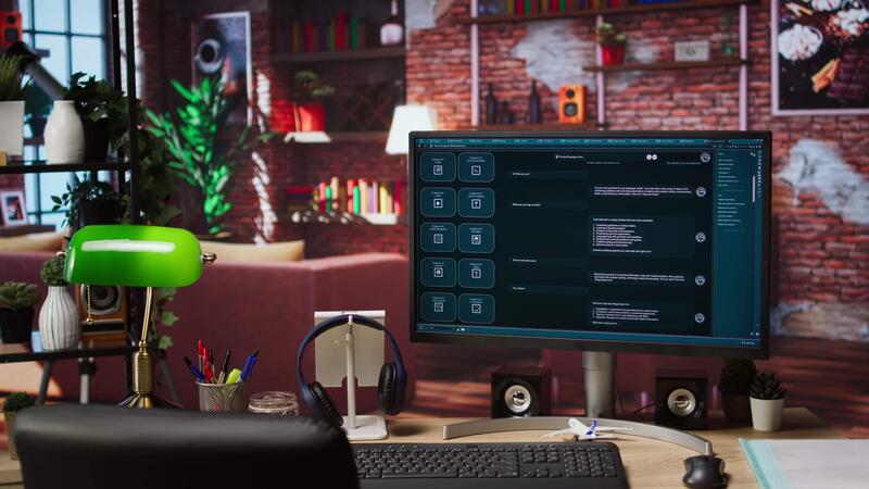 Focus on AI LLM chatbot GPT software on PC monitor in modern home office. Jib down shot of large language model application on computer display communicating with user through artificial intelligence Pro Video