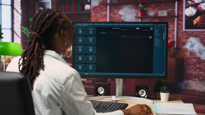 Woman seated at desk using AI LLM chatbot software in modern urban home office. Person requesting help from large language model program on computer in bright apartment workspace, camera B Pro Video