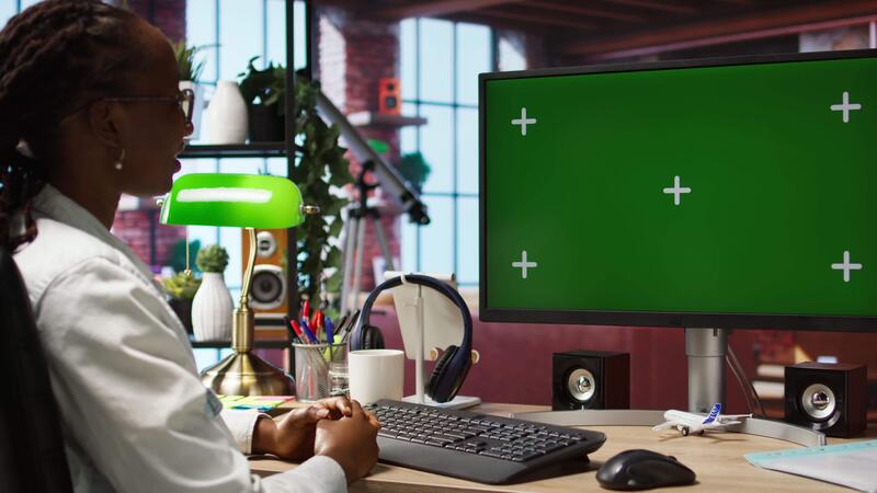 Teleworker at home using isolated screen PC display during job shift, analyzing data at desk, compiling reports. Remote worker doing tasks on chroma key computer, typing information, camera A Pro Video