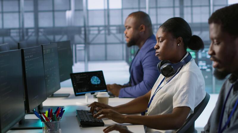 Admin in data center drinking coffee and implementing AI predictive maintenance systems. Server hub worker enjoying hot beverage, using artificial intelligence to identify hardware failures, camera A Pro Video
