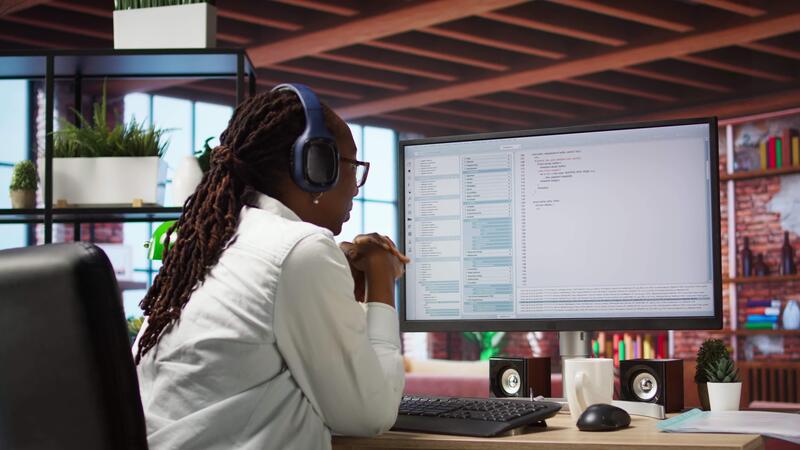 Jolly engineer in home office working on computer, dancing at desk in celebration after successfully executing code. IT worker wearing headphones happy after finishing compiling code, camera A Pro Video