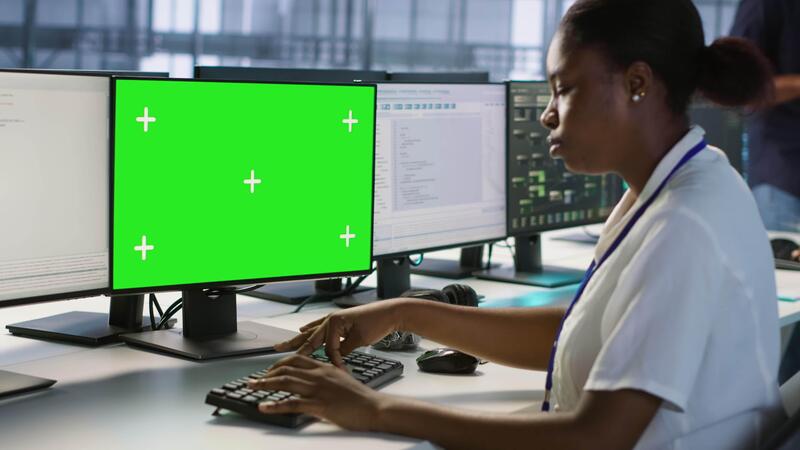 Data center technician using mockup PC, maintaining company network infrastructure. Server hub worker ensuring optimal system performance with green screen computer, camera A Pro Video