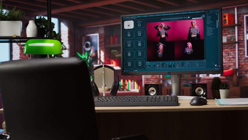 Computer in home office uses artificial intelligence generating images from basic text prompts. AI GPT generating photographs using computer vision and natural language processing, jib up shot Pro Video