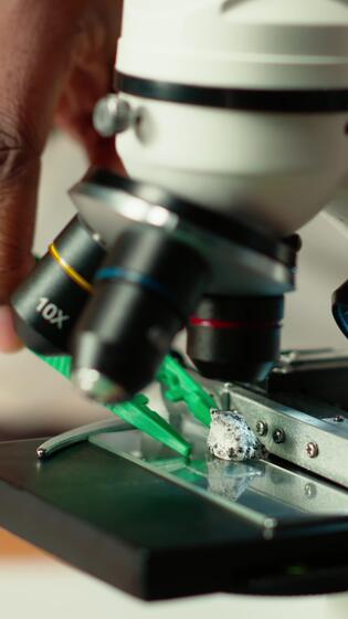 Vertical University student prepares for exam by researching cells and microorganisms under the microscope. Using books and papers from the academic database in the college library. Close up. Camera B. Pro Video