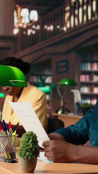 Vertical University student researches academic topics in a traditional library, using the classic study space to review lessons and organize course materials. Completing class notes for exams. Camera A. Pro Video