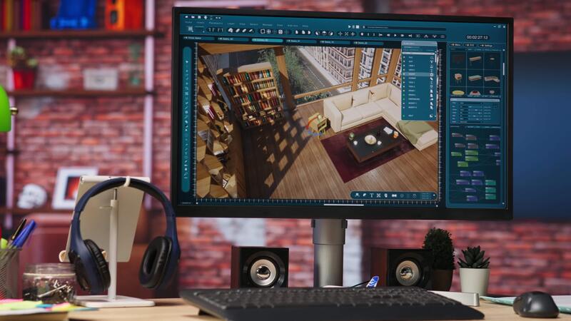 Assets being moved in 3D modeling program in rendered apartment for interior design project, handheld camera shot. Close up of CAD program used for modelling room virtual furniture Pro Video