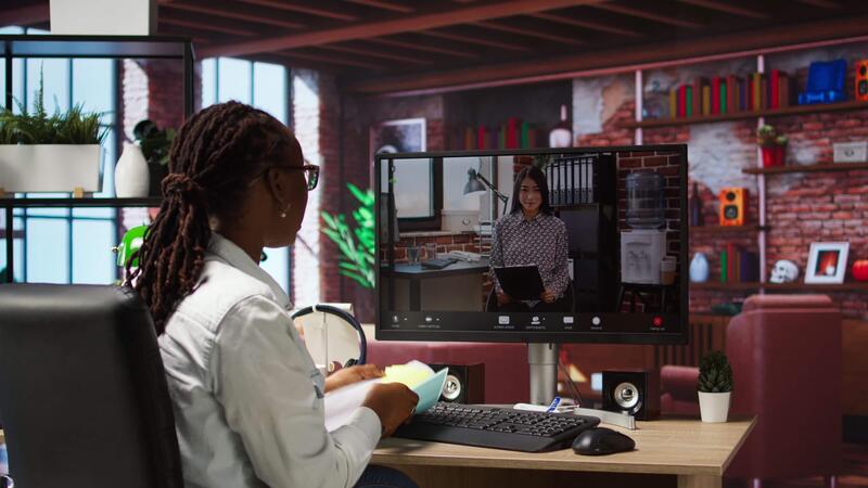Remote employee calls manager remotely using internet videocall to ask for feedback on project progress. Teleworker at home requesting assistance from team leader in teleconference meeting, camera A Pro Video