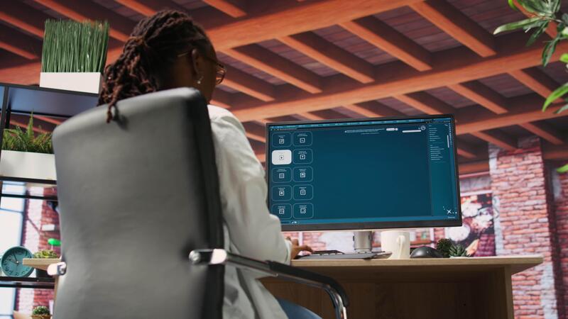 Woman at home using generative artificial intelligence website generating videos using diffusion models. Person drinking coffee and using AI virtual assistant producing clips, camera B Pro Video