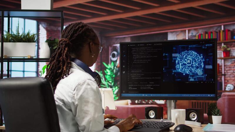 Admin writing code on computer and doing maintenance on artificial intelligence neural networks computerized model. Tech support expert typing on keyboard, doing checkup on AI systems, camera A Pro Video