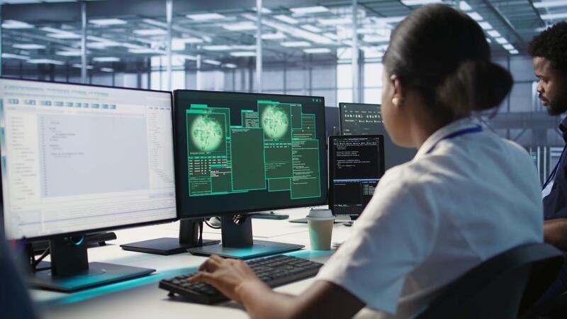 Admin in server hub trying to protect gear from hacker attack stealing sensitive information. Data center employee struggling to erase virus after seeing security breach alert on monitor, camera A Pro Video