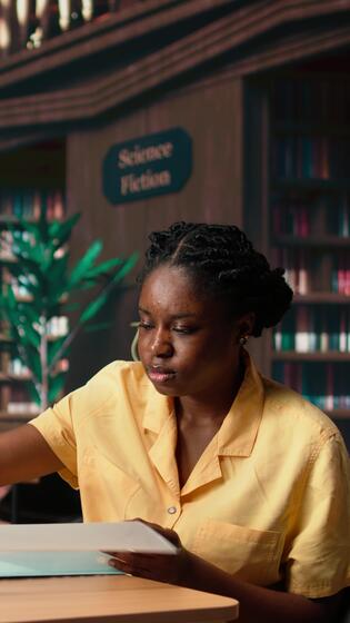 Vertical African american pupil highlighting key words from the class notes, creating a summary to study easily and memorize the lesson theory. Student using a learning technique in the library. Camera A. Pro Video