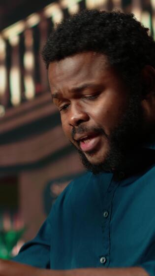 Vertical Black university student feeling anxious and struggling with learning, trying to memorize relevant information from course notes at the library. Male pupil studying to pass exams. Camera B. Pro Video