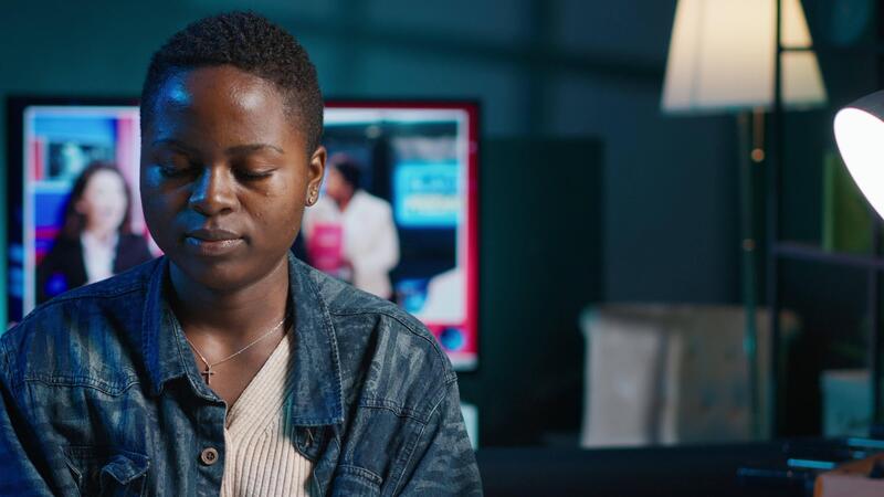 Portrait of smiling african american woman at desk typing on laptop keyboard, solving tasks. Joyful remote worker using notebook to send emails to business partners from living room, camera A Pro Video