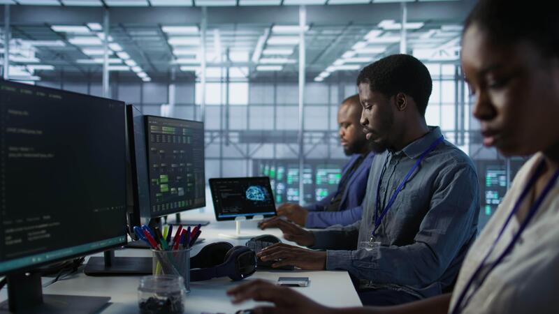 Team of engineers in data center developing and maintaining disaster recovery plans ensuring minimal downtime. Server room workers using data analytics to monitor performance, camera A Pro Video