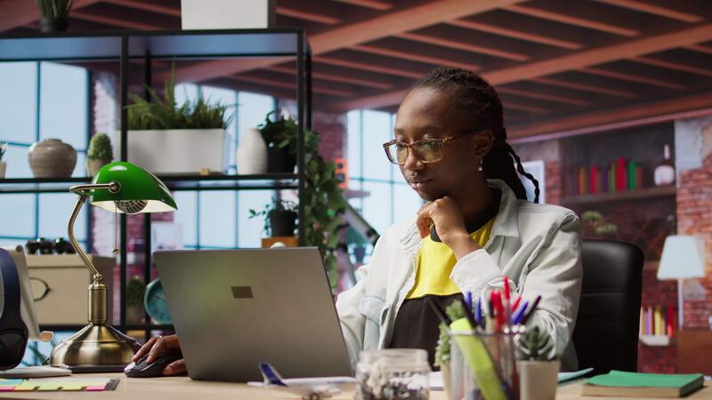 Teleworker using laptop in home office to crosscheck paper documents with online company files. Remote worker typing on notebook, inputting paperwork documentation data, camera A Pro Video
