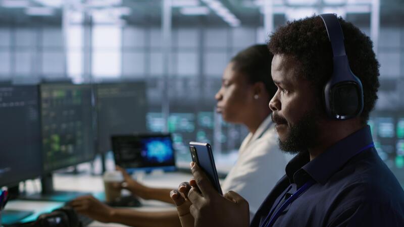Worker in data center wearing headphones taking break from implementing AI systems, using smartphone. Focus on artificial intelligence server farm employee using mobile phone, camera A Pro Video