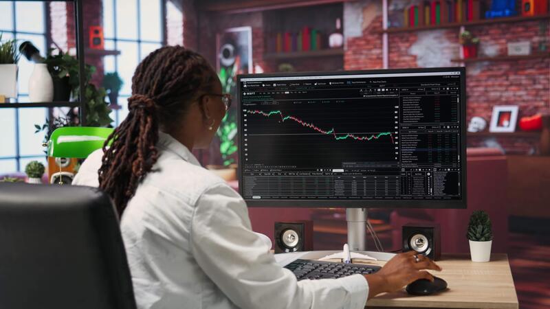 Excited day trader gaining money by selling stocks after browsing through documents to learn how to maximize profits. Thrilled investor celebrating financial gains earned from stock exchange, camera B Pro Video