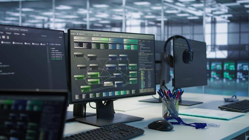 Close up of computer displays in empty data center establishment monitoring hardware energy consumption. PC screens on server hub office desk showing programming software Pro Video