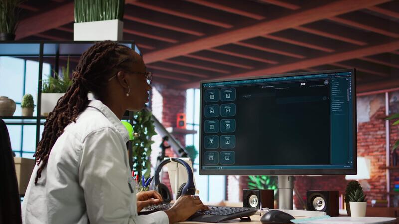 Student at home using AI LLM chatbot software to get help with solving homework. Girl requesting help from large language model program on computer device to do tasks, camera A Pro Video