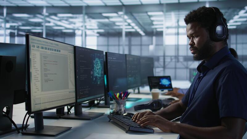 Computer scientist putting headphones on in server room, working to ensure minimal downtime. Engineer using audio device to hear podcasts in data center, monitoring performance, camera A Pro Video