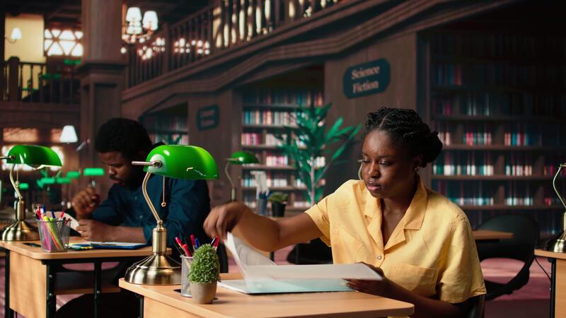 African american pupil highlighting key words from the class notes, creating a summary to study easily and memorize the lesson theory. Student using a learning technique in the library. Camera A. Pro Video